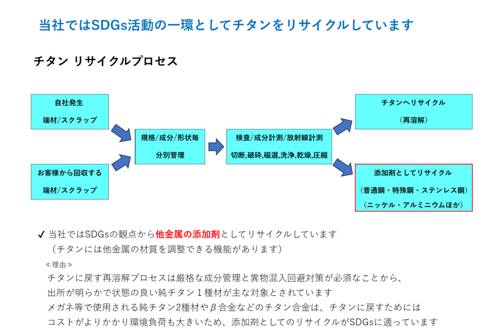 製造プロセスのところで説明しましたが、チタン精錬には多くのエネルギーを要します。そのため少しでも材料を有効活用するために、途中工程で発生する端材やスクラップなどはリサイクルされています。