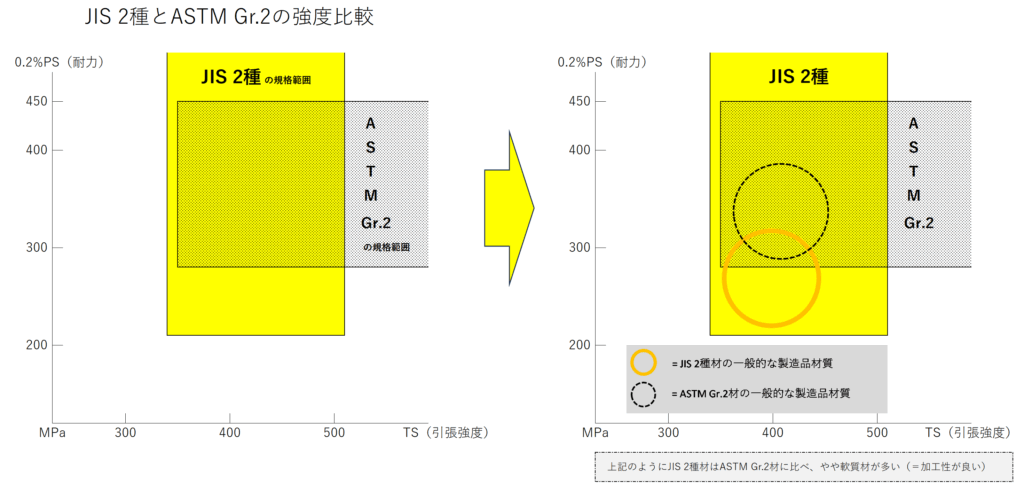 また、下の右グラフの2つの円はJIS 2種とASTM Gr.2それぞれの一般的な材質範囲を示しており、ここからも平均的にはJIS 2種材のほうが少し軟質であることが分かります。