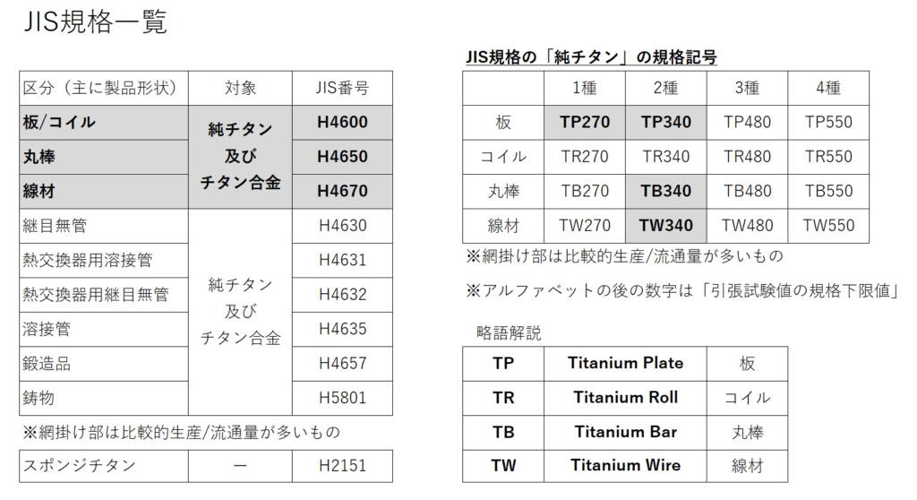 JIS規格では形状と用途により9種類(スポンジチタンを加えれば10種類)が設定されており、板またはコイルの場合は「H4600」、丸棒「H4650」、線材「H4670」という具合です。【下表参照】