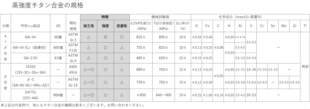高強度チタン合金は種類がたくさんありますが、流通している種類は限られています。区分として「α+β合金」「β合金」に大別されます。(「α合金」も存在しますが現在はほとんど生産されていません)