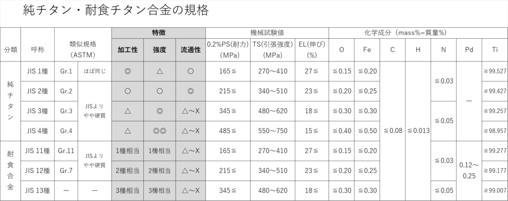 純チタンはJIS規格では強度別に4種類(1~4種)が設定されており、数字が小さいほど強度が低めで加工性が良い材質です。