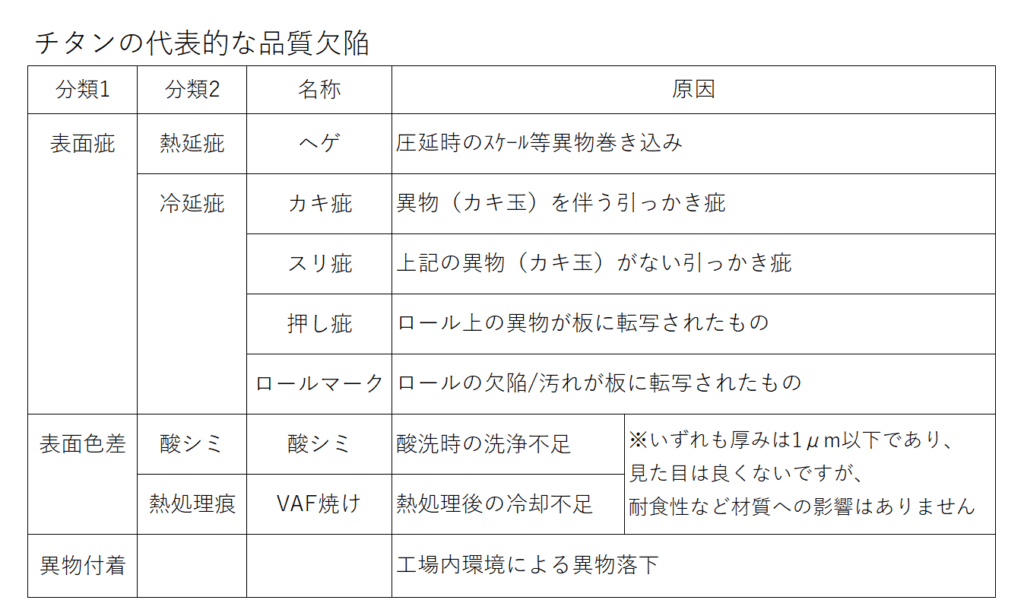 特にチタンはシミや汚れによる変色が出やすいという性質があるのですが、あくまで見た目だけで本来なら欠陥に分類されるものではないでしょう。それらも含めて、チタンの主な品質欠陥を右表でご紹介します。