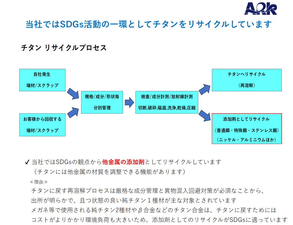 製造プロセスのところで説明しましたが、チタン精錬には多くのエネルギーを要します。そのため少しでも材料を有効活用するために、途中工程で発生する端材やスクラップなどはリサイクルされています。